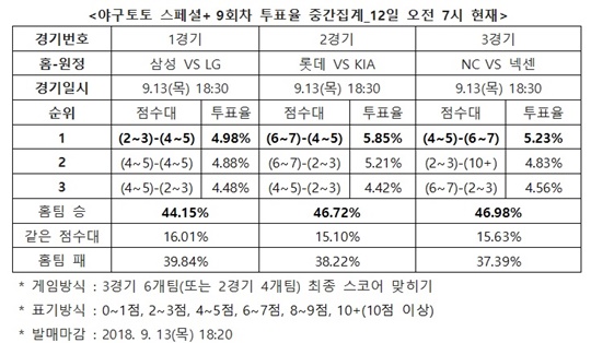 KBO 3경기 대상 야구토토 스페셜 플러스 9회차 투표율 중간집계