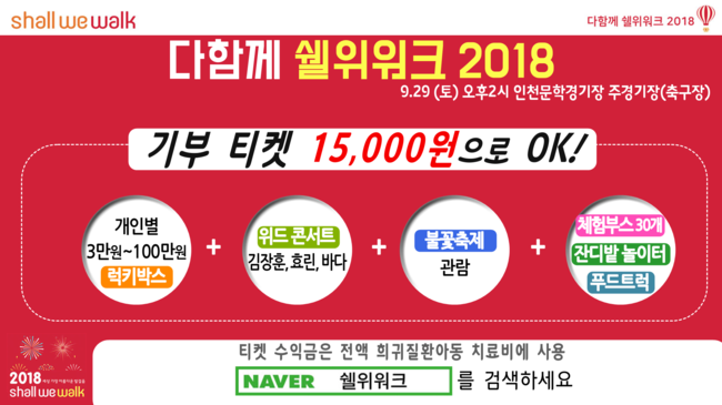 행사 참가를 위한 기부 티켓은 9월 13일(목) 오전 9시부터 옥션 홈페이지(www.auction.co.kr) 검색 창에 ‘쉘위워크’를 검색 후 구입이 가능하며 티켓 수익금 전액은 희귀질환 아동들 치료비에 쓰일 예정이다.
