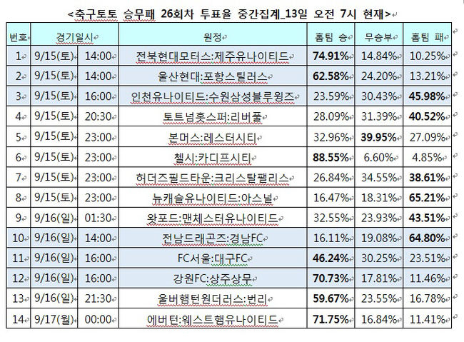 국내,외 프로축구 14경기 대상 축구토토 승무패 26회차 투표율 중간집계 결과