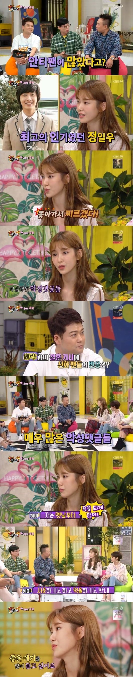 "에릭과 결혼 기사가 났을 때 팬들의 반응은 어땠냐?"고 묻자 나혜미는 "그때도 많은 악플이 달렸다. 난 옛날부터 욕을 되게 많이 먹었다. 서운하기도 하고 억울하기도 했다"고 말했다.