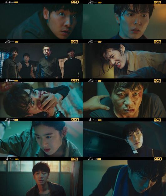 이날 김영수(전배수 분)의 딸을 구하기 위한 윤화평(김동욱 분), 최윤(김재욱 분), 강길영(정은채 분)의 짜릿한 첫 공조가 본격적으로 펼쳐졌다. 윤화평과 강길영은 ‘손’ 박일도 귀신에 빙의된 김영수와 숨 막히는 추격전을 펼쳤다. 사고로 뇌 손상을 입어 움직일 수 없었던 김영수는 기이한 힘에 의해 두 발로 달리고 있었다. 가까스로 김영수를 붙잡는 데 성공한 윤화평은 강길영을 옥상에 가둔 채 육광(이원종 분)의 집으로 향했다. ‘손’의 거대한 힘을 감당할 자신이 없었던 육광은 구마사제인 한신부(남문철 분)와 최윤을 불렀다. 구마의식이 펼쳐지자 ‘손’은 한눈에 최윤이 과거 최신부(윤종석 분)의 동생임을 알아봤다. 위급한 상황 속 한신부는 홀로 구마를 하겠다며 최윤을 내쫓았다.