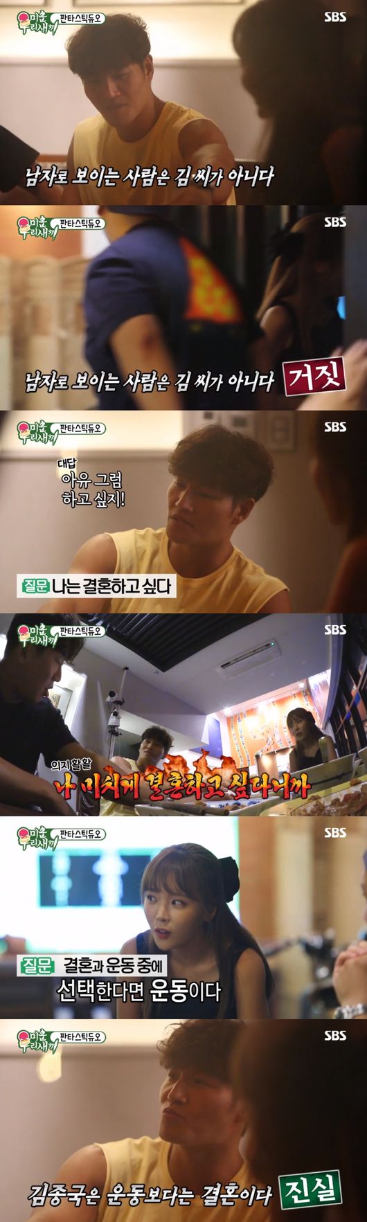 이후 홍진영과 김종국은 함께 식사를 준비했는데 마치 신혼부부의 모습 같았다. 홍진영은 김종국에게 각종 재료 손질을 부탁했고 김종국은 자연스럽게 홍진영과 부엌에서 달달한 분위기를 풍기며 요리를 했다. 신동엽은 “홍진영이 부탁하면 김종국이 다 들어준다”며 두 사람의 묘한 기류를 감지했다.
