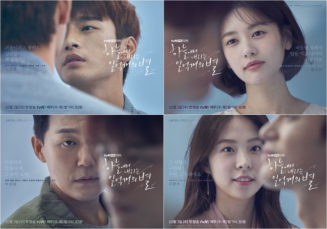 위험한 남자 무영(서인국 분)과 그와 같은 상처를 가진 여자 진강(정소민 분) 그리고 무영에 맞서는 그녀의 오빠 진국(박성웅 분)에게 찾아온 충격적 운명의 미스터리 멜로 tvN ‘하늘에서 내리는 일억개의 별’(유제원 연출, 송혜진 극본, 이하 ‘일억개의 별’) 측이 17일 서인국(김무영 역)-정소민(유진강 역)-박성웅(유진국 역)-서은수(백승아 역)의 ‘4인 4색’ 시선 포스터를 첫 공개했다.