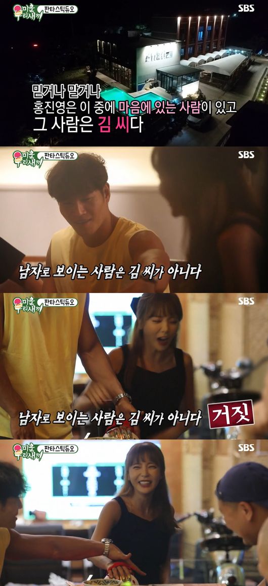 홍진영은 거짓말탐지기를 통해서 자신의 마음을 감췄다. 홍진영은 이 자리에 관심 있는 남자도 없고 성도 김씨가 아니라고 했지만 모두 거짓이 나왔다. 장난과 진심이 섞인 두 사람의 사이는 흥미진진했다.