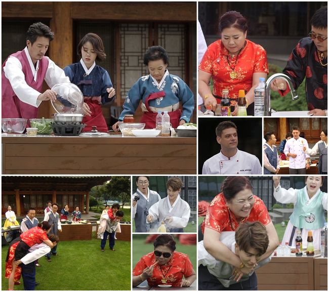 그런가하면 본격 요리대결 직전, 홈쇼핑 마니아 박명수가 준비한 ‘신박한 주방 도구 5종’을 차지하기 위한 ‘게임’이 진행돼 촬영장은 웃다 못해 눈물까지 흘리는 폭소 바다가 됐다. 박명수는 대결 종목으로 아들들이 어머니를 공주님처럼 안고 버티는 일명, ‘공주님 안기’를 제안했던 상태. 하지만 종목이 공개되자 정준호는 가뿐하게 어머니를 들어 올린 반면, 홍혜걸과 진화는 당혹스러운 기색을 감추지 못했다. 결국 대회를 하는 중간에 아들들이 어머니를 안고 구르는 몸 개그가 이어졌고, 진화는 어머니를 등에 업고 폭주기관차처럼 질주하는 모습으로 모두의 폭소를 터지게 만들었다. 이와 관련 세 가족의 몸개그 작렬 현장이 기대감을 모으고 있다.