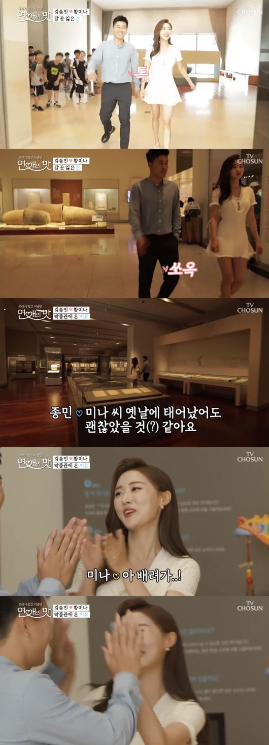 또한 황미나를 만나서 김종민은 마음에 있는 얘기를 다하겠다고 한 것처럼 솔직하게 마음을 표현했다. 황미나의 얼굴을 한참 보더니 “너무 예쁘다”고 하는가 하면 기상캐스터인 황미나에게 측우기를 보여줬고 황미나가 좋아하자 황미나와 손뼉치기를 하며 스킨십을 했다.