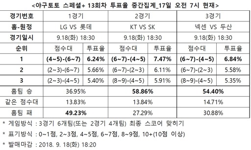 KBO 3경기 대상 야구토토 스페셜 플러스 13회차 투표율 중간집계