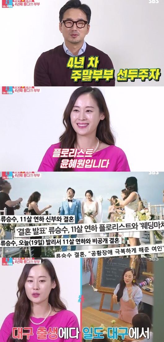 이날 류승수는 4년 차 주말부부답게 서울에서 혼자 사는 남자의 모습을 여과 없이 보여줬다. 대구에 생활 기반이 있는 아내를 위해 4년째 서울과 대구를 오가고 있었던 것. 11세 연하의 플로리스트인 류승수의 아내 윤혜원은 "결혼해도 일을 놓고 싶지 않았다"라고 설명해 이해를 도왔다.