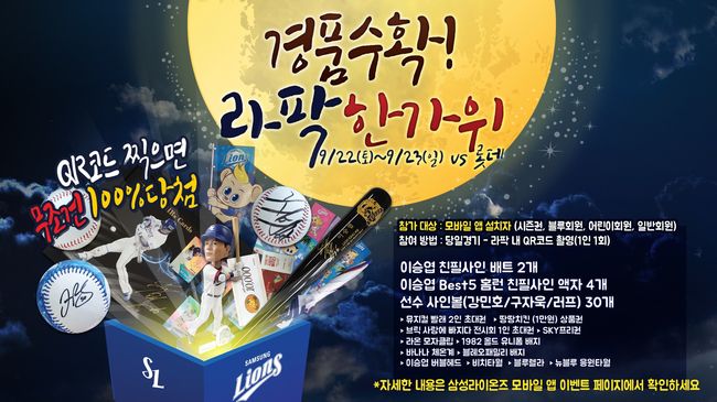 삼성 라이온즈가 결실의 계절을 맞이해 팬들에게 푸짐한 경품 수확의 기회를 제공한다. 무려 4만여 개의 경품이 대기중이다. 삼성 라이온즈는 오는 22~23일 대구 삼성 라이온즈 파크(이하 라팍)에서 열리는 롯데와의 홈 2연전 동안 '경품 수확! 라팍 한가위!' 이벤트를 진행한다.