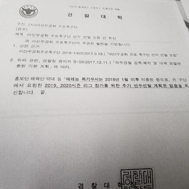 당황한 아산 구단은 확인차 선수 충원 요청을 경찰대학에 보냈다. 그러나 경찰대학은 지난 13일 선수 충원 불가에 대한 입장을 정리하여, 아산 구단에 공식적으로 발송했다. 이 과정서 연맹은 공식적으로 공문을 받지 못한 것으로 알려졌다.