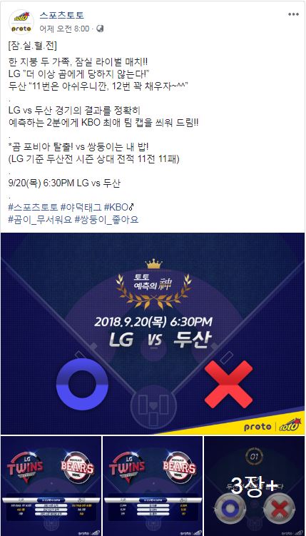 케이토토 관계자는, “스포츠토토 공식페이스북에서는 국내프로야구 최고의 라이벌 전인 LG와 두산의 맞대결 승리팀을 맞히는 이벤트를 준비했다” 며, “관전의 재미와 함께 경품 획득의 기회까지 주어지는 이번 이벤트에 많은 야구팬들의 관심과 참여를 기대한다” 고 전했다.