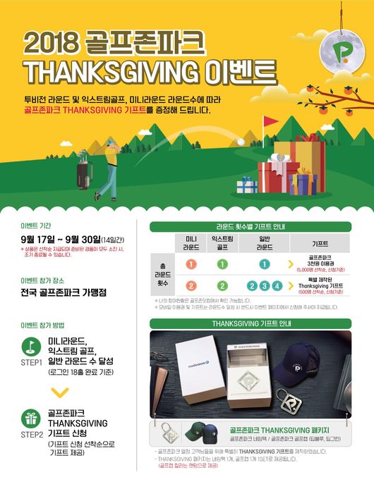 주어진 라운드 횟수를 완료 후 이벤트 페이지에서 기프트를 신청하면 선착순으로 골프존파크 땡스기빙 기프트를 지급한다.
