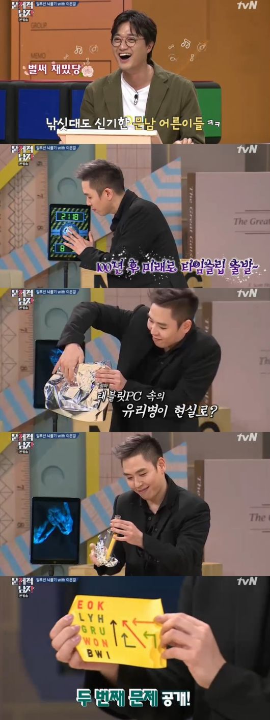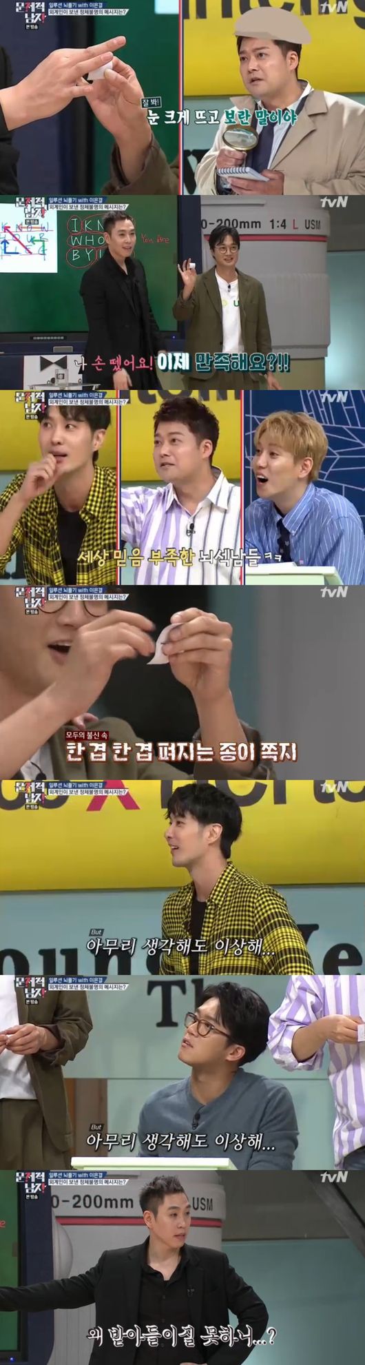 장원은 먼저 문제를 풀이했다. 하지만 풀어내지 못했고, 대신 하석진이 앞으로 도전했다. 문제 속 숨어있는 힌트로 멋지게 풀어냈다. 하파고 하석진이 첫번째 일루션 뇌풀기에 성공했다.
