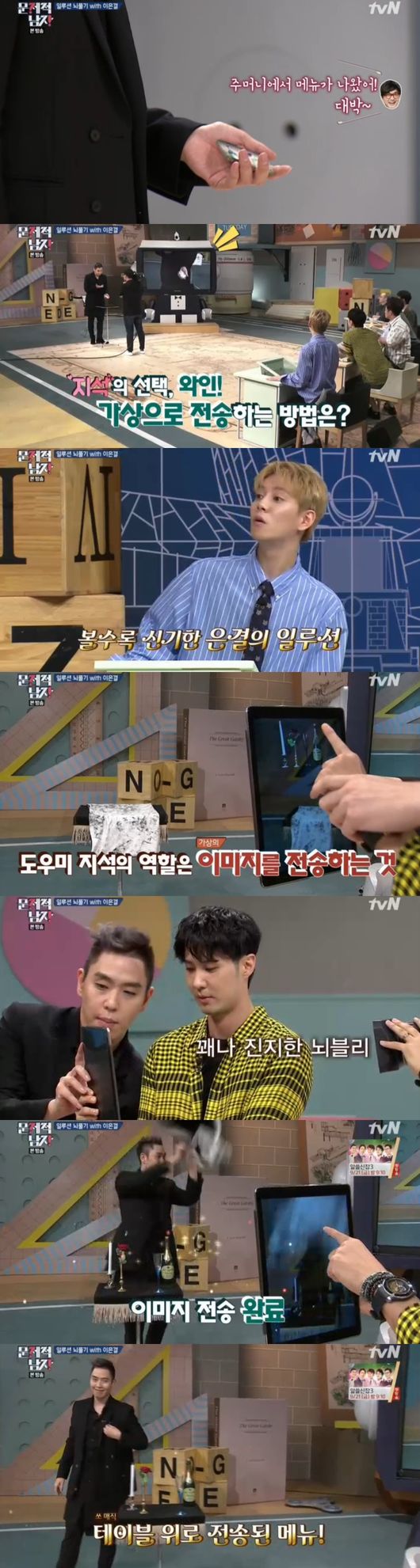 본격적으로 일루션 뇌풀기를 시작했다. 첫번째 문제 주인은 장원이었다. 이은결은 오래된 상상의 영역을 이용한 일루션이라고 했다. 손짓으로 조명을 컨트롤 해 어둡게 만들었고, 탁자위에 높은 두꺼운 책 옆에 있는 컵에 콜라를 담았다. 그림자 컵에 빨대를 꼽아마셨더니 눈 앞에서 컵 속에 콜라가 사라진 것. 신기한 광경에 모두 놀랐다. 이번엔 그림자 책을 쓰러뜨리는 건 물론, 입김으로 책을 열었다. 이어 "신기한 페이지를 봤다"면서 문제를 출제했다.