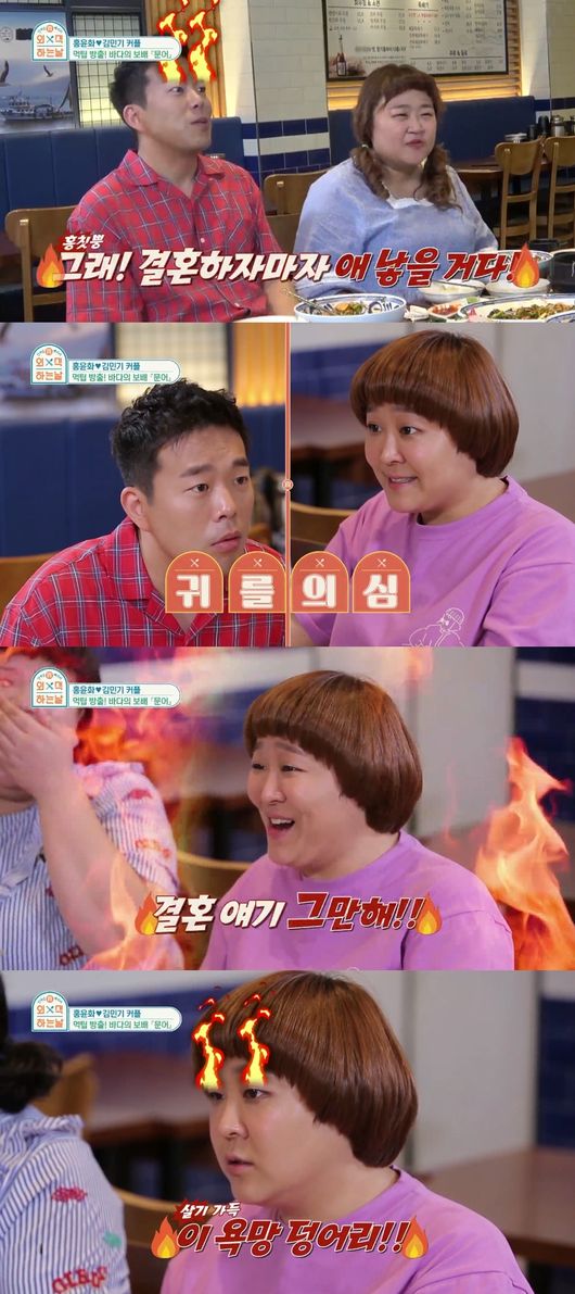 무아지경 먹방을 즐기던 홍윤화는 문어를 손수 김민기에게 먹여주며 꽁냥 커플의 애정을 과시했다. 이에 기분이 좋아진 김민기가 뽀뽀를 요구하자 윤효동은 “이 욕망 덩어리”라며 일침을 날리기도 했다. 김민기는 지지 않고 “그래, 결혼하자마자 애 낳을거다!”라고 티격태격 하는 모습으로 폭소를 유발했다.