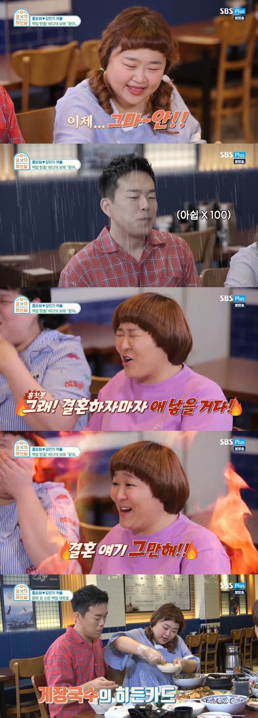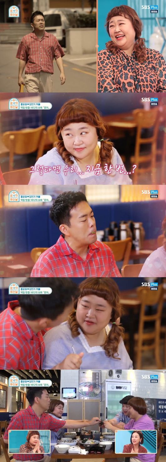 19일 방송된 SBS플러스 예능 ‘외식하는 날’에서는 예비부부 홍윤화와 김민기가 개그맨 동료 김기쁨, 윤효동과 외식을 하는 모습이 담겼다. 홍윤화를 비롯해 김기쁨과 윤효동 역시 타고난 먹성을 자랑했다.