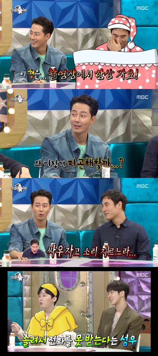 조인성은 절친한 선배 배성우에 대해 “이 형은 촬영장에서 항상 잔다(웃음)”며 “집에 있을 땐 전화도 잘 안 받으면서 SNS 메시지는 읽는다. 집에서 뭘하는지 촬영장에 와선 항상 자더라”고 폭로해 웃음을 안겼다. 이에 박병은이 “촬영장에서 ‘싸우자’고 소리를 질러 힘들어서 그럴 것”이라고 말해 웃음을 더했다.