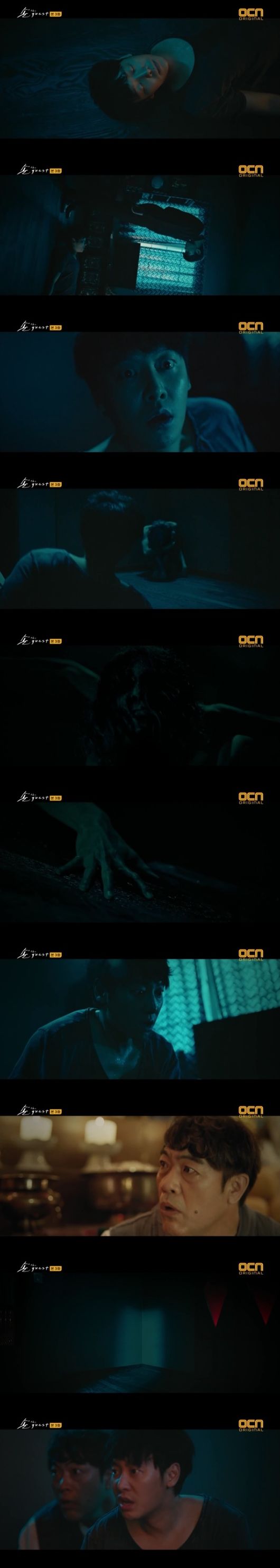 19일 오후 방송된 OCN '손 더 게스트(손 the guest)'에서는 윤화평(김동욱 분)이 꿈 속에서 박일도를 보고 질겁하는 모습이 그려졌다.