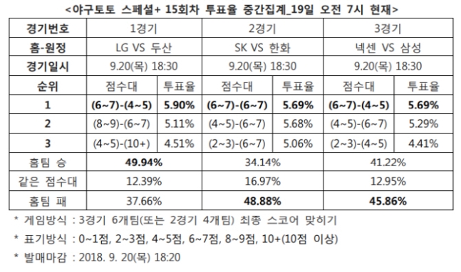KBO 3경기 대상 야구토토 스페셜 플러스 15회차 투표율 중간집계