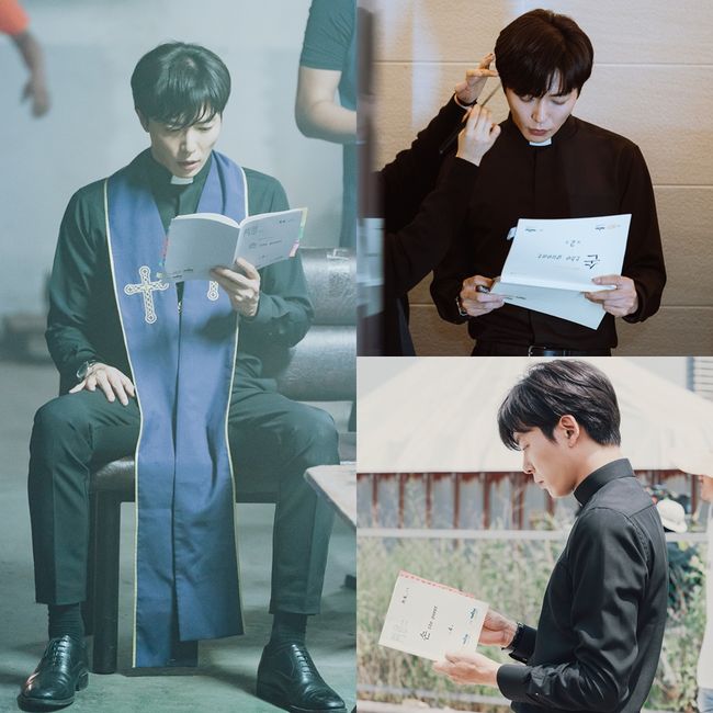 사진 속 김재욱은 때와 장소를 가리지 않고 대본을 손에 꼭 쥐고 대사를 읊어보며 캐릭터에 완벽하게 몰입한 모습이다. 현장에서 김재욱은 최윤이 느끼는 감정과 숨을 멎게 만드는 구마의식 장면을 위해 고민을 거듭하고, 반복해서 대본을 숙지하며 최선을 다하고 있다. 한 순간도 대본을 손에서 놓지 않는 숨은 노력과 뜨거운 연기 열정은 완성도 높은 장면들의 탄생으로 이어져 연일 호평이 쏟아지고 있다.