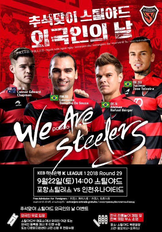민족 대명절 추석을 앞두고 펼쳐지는 이날 경기는 타국에서 생활하며 고향의 명절을 그리워할 외국인들을 위해 ‘외국인의 날’로 진행된다. 여권, 외국인 등록증, 학생증 등 외국인임을 증명할 수 있는 신분증을 스틸야드 N1 매표소에 제시하면 입장권을 받을 수 있다. 포항 다문화센터에 사전 신청 후 현장수령도 가능하다.