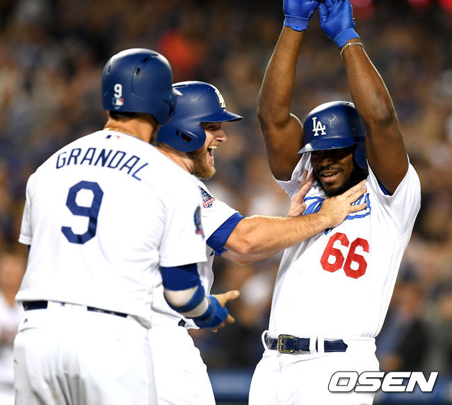 다저스가 2-2로 맞선 7회말 1사 2,3루에서 로버츠는 대타 푸이그로 승부를 걸었다. 푸이그는 시원한 스리런 홈런으로 보답했다. 덕분에 다저스는 가을야구에 한 걸음 더 다가섰다. 연이어 해결사가 등장하는 다저스는 두터운 선수층의 덕을 톡톡히 보고 있다. / jasonseo34@osen.co.kr