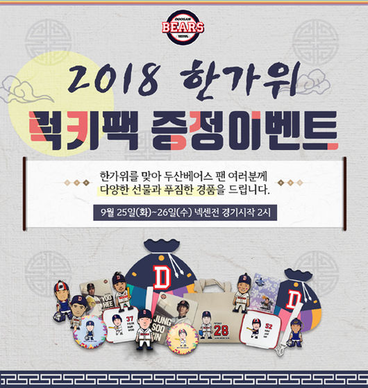 두산 베어스가 추석 연휴 기간인 25~26일 잠실야구장에서 펼쳐지는 넥센과 홈경기에서 럭키팩 증정 이벤트 및 전통 민속놀이 체험 등 한가위 특별 행사를 진행한다.