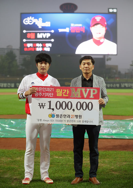 KIA 타이거즈 포수 김민식이 구단 지정병원인 밝은안과21병원이 시상하는 8월 월간 MVP에 선정돼 20일 광주 NC전에 앞서 시상식을 가졌다.