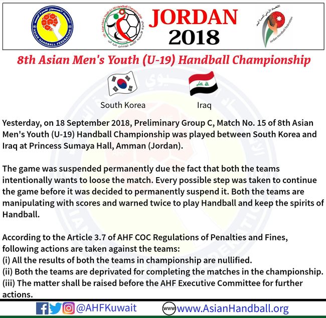 아시아핸드볼연맹(AHF)은 20일 "한국과 이라크의 18일 경기는 두 팀이 서로 지려고 하는 의도가 강했기 때문에 몰수 게임으로 처리했다"고 밝혔다.