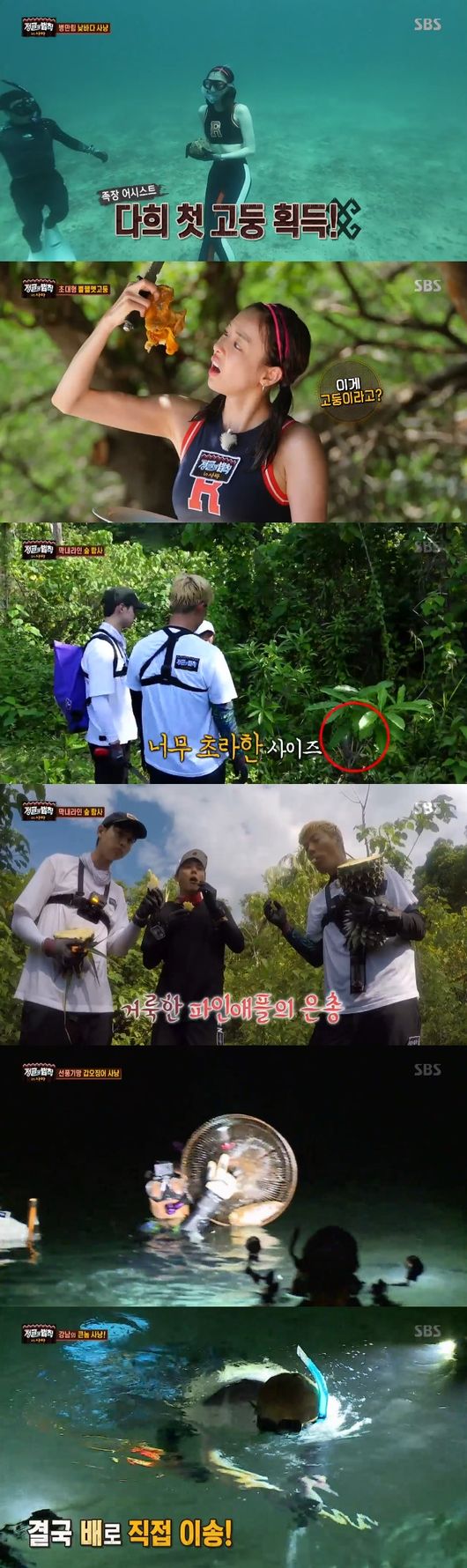 한편 본 섬에 남은 멤버들은 바다사냥과 숲 탐색에 나섰다. 바다사냥을 나간 김병만, 박정철, 이다희는 잠수를 하며 바다 속을 수색했다. 이다희는 “잠수 연습할 때는 몰랐는데 바다에 오니까 무섭더라”고 당시를 회상했다. 무서워하는 다희를 위해 김병만이 손을 잡고 함께 바닥으로 내려갔고 첫 고둥을 수확했다. 이후 자신감을 얻은 이다희는 초대형 고둥 네 마리를 잡으며 대활약했다.