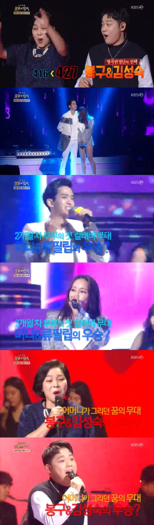 홍혜걸 여에스더 부부가 4월과 5월의 ‘장미’ 무대를 펼친 가운데, 미나 류필립 부부의 벽을 넘을 순 없었다. 마지막으로 봉구와 어머니 김성숙은 유심초의 ‘사랑이여’ 무대를 선보였다. 그결과 427점으로 최종 우승했다. / besodam@osen.co.kr
