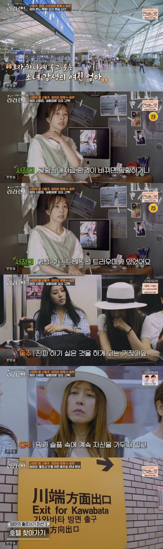 일본으로 가는 비행기에 올랐고, 드디어 후쿠오카에 도착했다. 가까우니 지하철타자는 동주와 택시를 타자는 母의 의견이 갈렸다. 이때, 서정희가 심한 스트레스를 보였다. 서정희는 "외상 후 스트레스성이 있다, 공황장애가 와서 죽을 것 같더라"면서 인파 속에 둘러싸여 불안했던 마음을 보였다. 이혼의 아픔을 격으며 사람 많은 곳은 두려워졌다고. 동주는 "슬픔 속에 스스로 가두지말고 노력했으면 하는 바람이었다"면서 아픔 속에서 벗어나길 바라는 딸의 마음을 보였다.