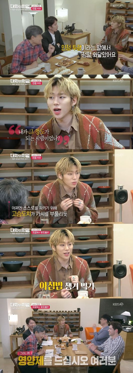 강원국 작가가 말한 ‘인정 투쟁’이라는 말에 깊이 공감한 지코는 “‘날 좀 봐줘. 나 이만큼 한다고. 더 보여줄게’하면서 더 쏟아낸 거다. 그렇게 모든 것을 쏟아내고 나니까 내 가사 안에서 강하게 직설적이게 표현을 했는데 내가 그 정도가 되는 사람인가를 스스로 생각해보게 되더라. 나는 그렇게 강하지는 않을 것 같은데 방어 기제에서 비롯된 것이 아닐까 싶었다. 이제 안에 있는 저를 살피기 시작했다”고 털어놨다. 그 일환으로 지코는 일어나서 아침밥을 거르지 않고 영양제를 챙겨 먹기 시작했다고 밝혀 웃음을 자아내기도 했다.