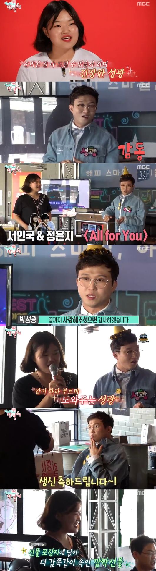팬미팅이 끝난 후 송이 매니저도 박성광을 위한 선물을 준비했다. 송이 매니저는 편지도 건네며 "집에 가서 읽어보라"고 쑥스러워했다. 편지를 조용히 읽은 박성광은 "이대로 지켜줘"라고 화답했다.