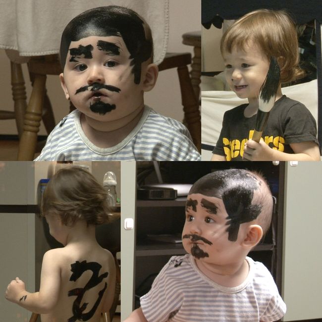 풍성한 머리숱 같은 먹물 낙서가 마음에 드는지 벤틀리는 해맑은 표정으로 방긋방긋 귀엽게 웃고 있다. 얼굴에 먹물로 낙서를 해도 귀여움이 사라지지 않는 윌벤져스 형제가 사랑스럽고 깜찍하다.