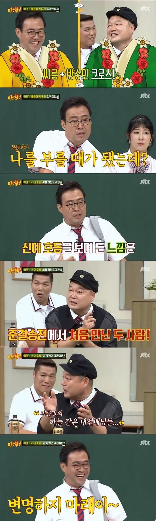 이만기와 강호동도 자연스럽게 두 사람이 맞붙은 경기들을 회상했다. 이만기는 강호동을 자신의 대를 이을 후배라고 직감했고, 강호동은 이만기에 “씨름판 대선배님이었다, 우상 같았던 마음의 영웅”이라고 말했다. 하지만 그런 호적수였던 두 사람은 씨름판에서만은 날선 심리싸움을 하는 앙숙이었다고.