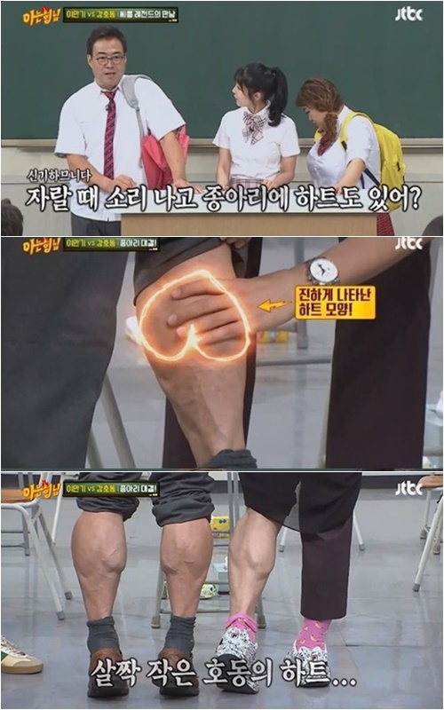 멤버들은 강호동에게 "한 번 대봐라"라고 말했고, 강호동은 부끄러워하면서 자신의 종아리 근육을 공개했다. 멤버들은 강호동 종아리 근육을 보고 "진짜 하트가 있다"라며 놀라워 했고, 이만기도 “아직 살아있네”라고 평했다.