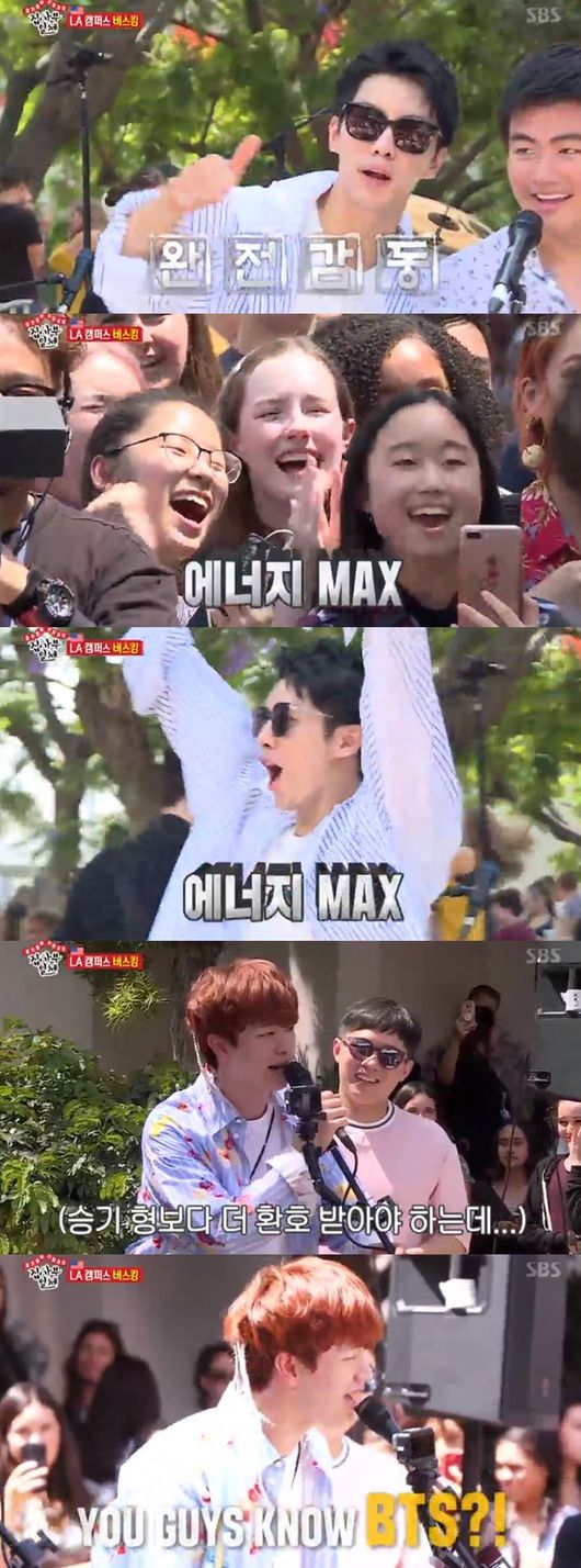 '집사부일체' 제자들이 미국 고등학교에서 즉석 버스킹 공연을 선보였다.