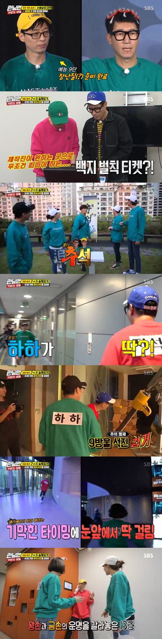 유재석과 지석진은 제작진이 정한 행선지로 갑자기 떠나야만 하는 백지 티켓 벌칙에 질색하며 "벌칙 받고 싶지 않아"라고 승리를 다짐했다. 열 개의 방울 중 9개를 지석진이, 1개를 유재석이 나눠 가지며 효율적인 작전을 짜기도 했다. 하지만 지석진은 레이스 1분 만에 하하와 마주쳐 허무하게 잡히고 말았다.
