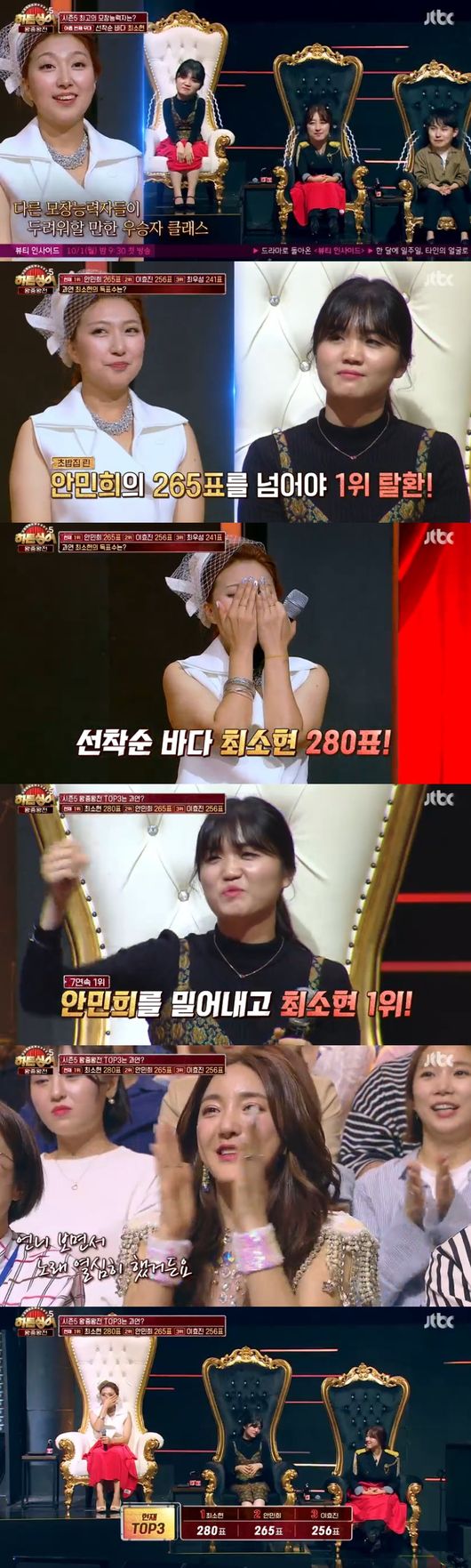 청하는 "일요일마다 진행하는 라디오에서 직접 자이언티가 라이브를 불러준 적 있다"면서 "무대를 보니 비슷한 부분이 있더라, 추임새가 특히"라면서 끝음절 처리도 비슷하다고 했다. 긴장감이 감도는 가운데, 박준영은 178표를 받으며 탑쓰리 왕좌에 실패했다. 안민희는 7연속 부동의 1위를 차지했다.