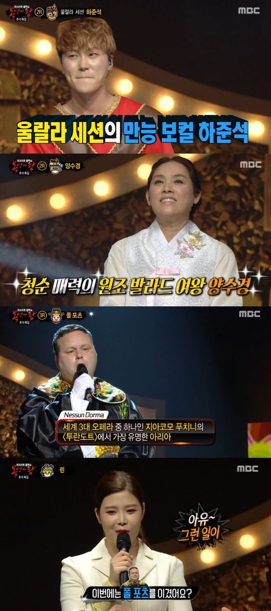 복면가수 콜로세움과 포청천, 과일바구니와 열대새가 동막골소녀와의 대결을 위해 각각 맞붙었다. 마지막까지 살아남은 열대세가 동막골소녀의 적수로 떠오른 가운데 정체를 드러낸 콜로세움은 울랄라세션의 하준석, 포청천은 오페라 가수 폴 포츠, 과일바구니는 올해 데뷔 30주년을 맞은 가수 양수경이었다.