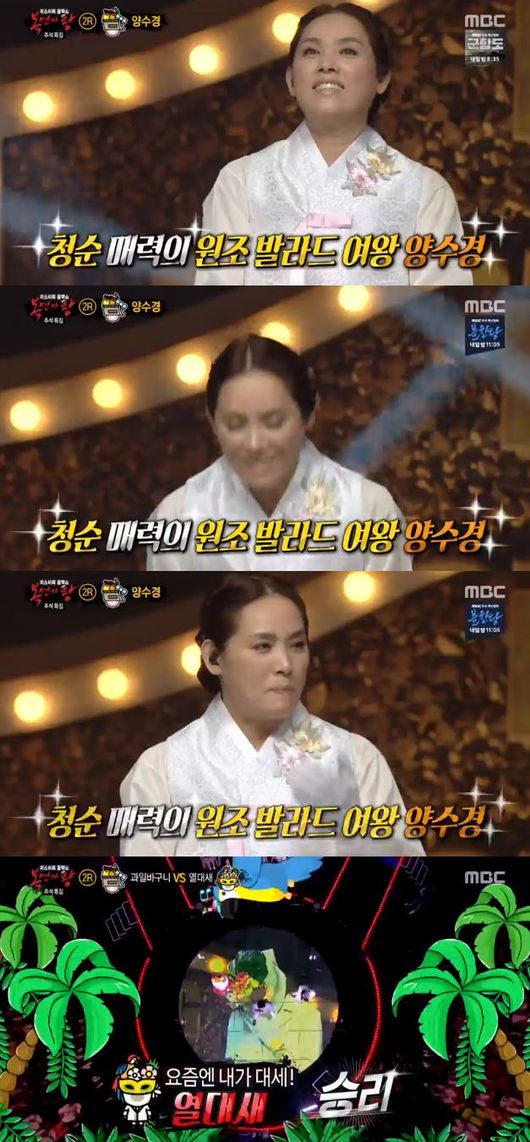 이날 2라운드에서 신중현의 ‘빗속의 여인’을 부른 과일바구니의 정체는 원조 발라드 여왕 양수경이었다. 얼굴을 공개한 후 포털에는 ‘양수경’, ‘복면가왕 과일바구니’ 등 실시간 검색어가 상위권에 오르는 등 양수경에 대한 관심이 높았다.