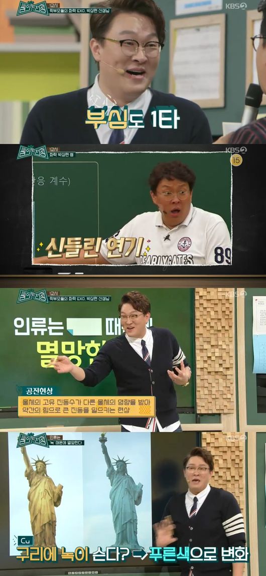 화학으로 푸는 인류멸망 얘기라며 수능예언까지 포인트로 전했다. 이때, 1년전 미국의 한 놀이공원에서 일어난 사고 영상을 전했다. 미국의 다리 붕괴사건까지 종합정리했다. 바로 '녹'이었다. 이어 미국의 자유의 여신상이 원래 갈색의 구리색이었으나, 녹이 들어 푸르게 변한 거라고 했다. 녹 때문에 발생하는 비용이 어마어마하다고.