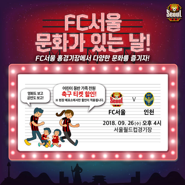 FC서울은 가족 단위 팬들이 축구 경기를 즐길 수 있도록 티켓 할인 혜택을 제공할 예정이다. 어린이 동반 가족이 현장 매표소에서 구매 시 일반석 50%, 동측지정석 30%, 서측지정석 30% 할인 혜택을 받을 수 있다.