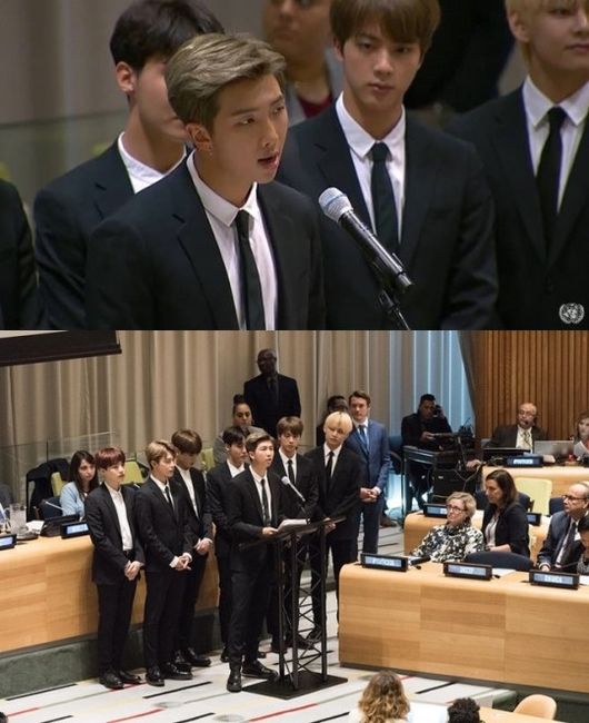 방탄소년단 리더 RM은 UN총회에서 '자신을 사랑하자'는 내용을 담은 연설을 했고, 약 7분간 능숙한 영어 실력을 바탕으로 실수없이 훌륭하게 소화했다. 또, 이 자리에서 영부인 김정숙 여사를 만나 반갑게 인사를 나누고, 사진도 찍었으며, 김정숙 여사는 방탄소년단을 향해 "자랑스럽다. 진심으로 축하한다"는 인사를 건넸다고.