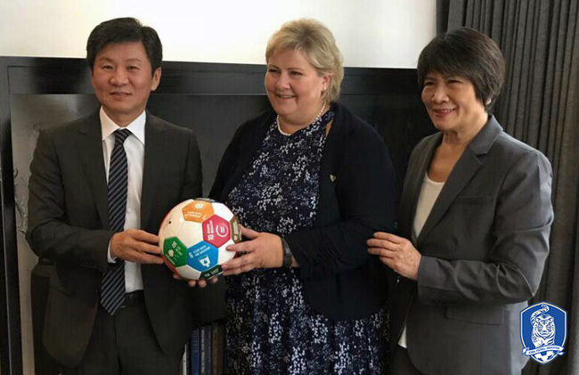 KFA 정몽규 회장이 UN SDGs(지속가능개발목표, Sustainable Development Goals) 자문위원회 공동의장인 솔베르그 노르웨이 총리에게 특별히 제작된 축구공을 지난 23일(현지시간) 뉴욕에서 전달했다고 밝혔다.