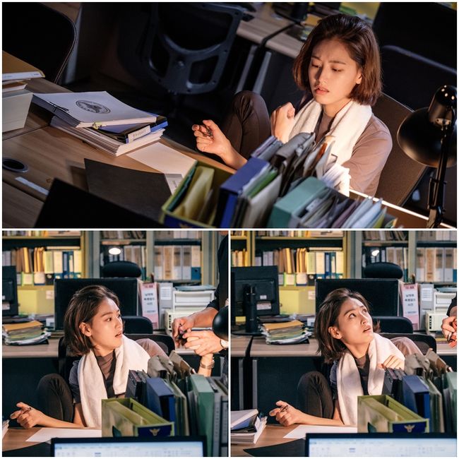 젖어있는 머리, 터프하게 걸친 수건, 보이시한 눈빛이 광역수사대의 어수선한 분위기와 완벽히 어우러지고 있는 가운데, 과연 지우가 야근을 하게 된 배경은 무엇인지, 지우의 활약은 어디까지 이어질 지 궁금증을 자아내고 있다.
