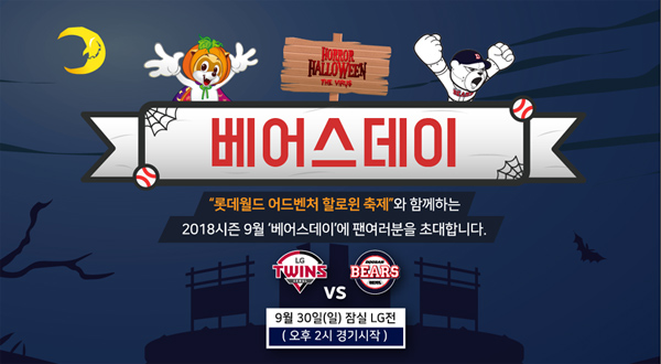 두산 베어스가 30일 잠실에서 열리는 LG와의 홈경기에서 ‘롯데월드 어드벤처 할로윈 축제’와 함께하는 '베어스데이(BEARS DAY)'를 실시한다.
