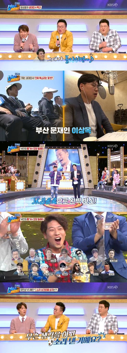 ‘다중이 보이스’ 임준혁 씨와 ‘고막 남친’ 박상우 씨는 인순이의 ‘거위의 꿈’을 노래하며 각자 자신 있는 성대모사를 선보였다. 두 사람이 무려 14인의 가수 모창 릴레이를 펼친 것이다.