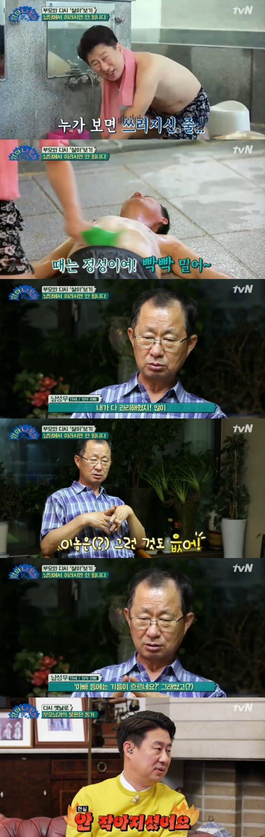 이어 희석은 父와 함께 목욕탕을 찾아갔다. 과거 父가 오랫동안 했던 목욕탕 집이었다. 오랜만에 父 등을 밀어주며 옛날 얘기에 빠졌다. 기분이 좋아진 父는 온 몸을 밀어달라며 아예 바닥에 벌러덩 누웠다. 남희석은 "누가 보면 쓰러진 줄 알겠다"고 당황, 父는 "아버지 작아진 등을 보라고 한건데 이 놈은 그런게 없다, 다리가 더 두꺼워졌다더라"고 했다. 남희석은 "진짜 더 커지셨다"고 말하며 뜻밖에 감동파괴로 웃음을 안겼다.